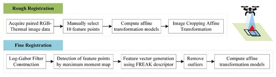 During the construction of most forest fire RGB-T data sets, the image registration process is usually carried out by manually selecting feature points, or by using general feature point matching methods such as ORB [20] or SIFT [21]. We propose a two-stage bimodal image alignment framework, termed M-RIFT, to improve the accuracy and robustness of matching heterogeneous image data, as shown in Figure 5. In the rough alignment stage, manually selected feature points are used as the coarse alignment step for image resizing to quickly overcome the initial geometric distortion. In the fine alignment stage, we adopt the RIFT multimodal image matching method [22]. First, feature points in the image are detected via the maximum moment map. Then, the maximum value index in each direction is searched to construct the maximum index map. Next, the FREAK descriptor is used to generate the feature vector, and homonymous point pairs are obtained based on the nearest-neighbor strategy. After removing outliers, the affine transform model between images is derived. This approach enables the rapid and accurate establishment of feature correspondences and optimization of matching results.