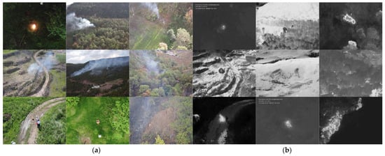 The multi-scene, multi-target and multimodal forest fire aerial photography dataset (RGBT-3M dataset) contains 22,440 images (i.e., 11,220 pairs of images) of fire frames, which were annotated using LabelImg (version: 1.8.6), and the labeled targets were smoke, fire, and person, with the numbers of 13,574, 11,315, and 5888. Infrared images lacked obvious smoke features, so we provided labels excluding smoke targets. The dataset is divided according to the ratio of 7:3 to form the training set and validation set, some representative scenes are shown in Figure 7, and the specific data are shown in Table 3. The dataset will be updated to the website: https://complex.ustc.edu.cn/.