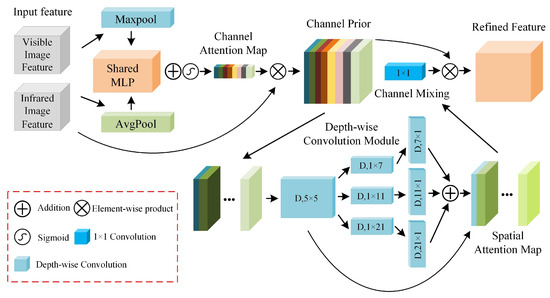 To address the visible and infrared feature interaction problem, we designed a feature interaction module. As shown in Equation (4), visible and infrared features are processed via channel prior convolutional attention [25] to compute channel and spatial attention, after which they are combined element-wise with the original visible and thermal infrared features: