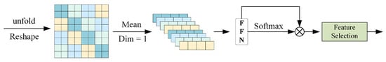 , , are computed through the three branches, and the weighted sum is derived as . The attention module consists of a series of channel attention and spatial attention. Thereafter, is processed sequentially by one-dimensional channel attention maps and , as shown in Equation (7):