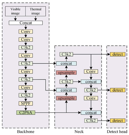 Therefore, YOLOv11 is adopted as the baseline scheme in this study, and the classic three-stage architecture design balances feature abstraction capability and computational efficiency, providing a robust baseline framework for subsequent model improvement. The input resolution of visible and infrared images is denoted as . The backbone network extracts feature at different scales via multi-convolutional down-sampling. When the feature map resolution is , feature interaction design performs cross-modal information interaction by extracting features from different modal networks. After passing through the C3k2 feature fusion module, feature splicing design is applied before feeding into the neck network.