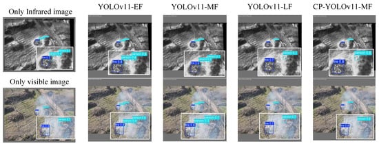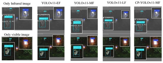 In order to verify the effectiveness of the RGB-Thermal bimodal target detection algorithm model, in this section, the YOLOv11 model is utilized to train the infrared and visible images separately to obtain the detection results in a single modality, i.e., the YOLOv11 network model processes the two types of images, visible and thermal infrared, and directly outputs the detection results without any fusion. As shown in Table 8, the performance of each model under single-modal detection and different detection fusion frameworks is compared.