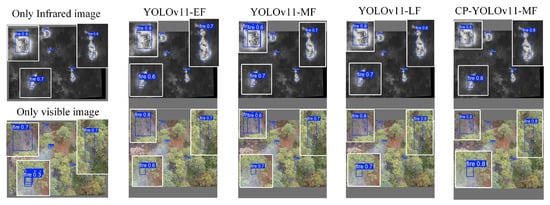 For single-modal comparison, we selected RTMdet [27], a single-stage target detection algorithm with similar model complexity to YOLOv11, and FasterRCNN [28], a well-known two-stage target detection algorithm, for comparison experiments. Table 6 presents a comparison of the effect of single-modal detection methods.