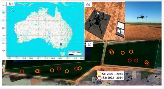(a) Location of the commercial rice farm in the Murrumbidgee region of New South Wales, Australia (indicated with a blue dot). (b) Image of the unmanned-aerial-vehicle-based multispectral system and calibration panel used in the study. (c) Monitored bays and areas of interest for the 2022/2023 (orange circles) and 2023/2024 (red circles) growing seasons.
