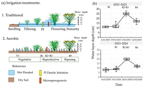 (a) Illustration of the irrigation management strategies used in the study, (b) water layer depth measured in the ponded bay at panicle initiation (R1), microsporogenesis (R2−R3), and flowering (R4) for each rice growing season. Vertical bars indicate the standard deviation.