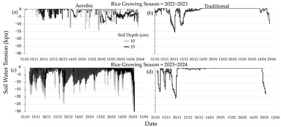 Soil water tension measured with watermark sensors at 10 cm (gray line) and 15 cm (black line) during both rice growing seasons in the aerobically (a,c) and traditionally (b,d) managed bays.