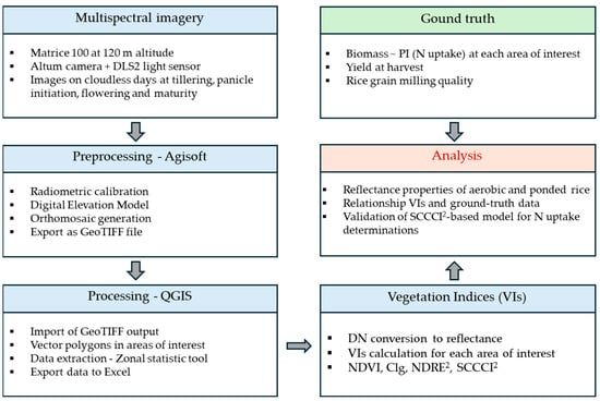 Multispectral images were collected four times across the growing season in the first and second year of study, corresponding approximately with the phenological stages of tillering, PI, flowering and maturity. Images were collected from an unmanned aerial vehicle (UAV; Matrice 100, DJI, Shenzhen, China) with the Altum camera (AgEagle Aerial Systems Inc., Wichita, KS, USA) that captures information from the blue, green, red, red edge, and near-infrared (NIR) spectral bands centered at 475, 560, 668, 717 and 840 nm, respectively. Flights were automated using the Pix4Dcapture app that was set up to collect images at 120 m altitude with an 80% overlap. These settings provided a pixel resolution of ~5.6 cm. The spectral bands used to calculate the vegetation indices in this study were the green, red, red edge and NIR bands. An image of a calibration panel was collected before and after each flight to remove the effects of sunlight variation. Information from the radiometric target, camera gain and exposure settings and a Downwelling Light Sensor (DLS2) that provides information about the illumination at the moment each image was collected, was used for the radiometric corrections when the images were processed with the Agisoft software (version 1.8.0, Agisoft Metashape, Saint Petersburg, Russia). A schematic illustration of the methodology followed in this study is provided in Figure 4. The Geo-TIFF files generated for each set of images with information of the multispectral bands were post-processed in QGIS (version 3.26). Four areas of interest of ~397 m2 each (radius = 11.25 m), where soil moisture and plant measurements were conducted at different times during the growing seasons, were delimited in both bays. Since there was no treatment to cause variability in the present study, the location of the four areas of interest within each bay were selected based on the (low) variability in NDVI observed in the previous growing season from satellite imagery. The zonal statistical tool was used in QGIS to obtain the average reflectance of the five spectral bands captured with the camera on each measurement date for each area of interest. This information was exported from the attribute table and used to compute the vegetation indices in Excel. The formulation of the multispectral indices used in this study are shown in Table 3.