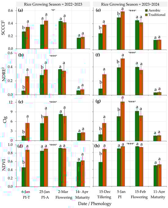 Mean values of the (a,e) squared simplified canopy chlorophyll content index (SCCCI2), (b,f) squared normalized difference red edge index (NDRE2), (c,g) chlorophyll green index (Clg), and (d,h) normalized difference vegetation index (NDVI) for each measurement date. Vertical bars indicate the standard deviation. The phenological stages at which the aerobic and ponded rice were at each measurement date is also indicated (PI-T = ponded rice at panicle initiation; PI-A = aerobic rice at panicle initiation). Different letters within irrigation treatments for each date indicate statistically significant differences for the interaction between irrigation and date effect by rice season (p < 0.001 ‘***’, p < 0.05 ‘*’).