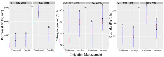 Above-ground plant biomass (a), N% (b), and N uptake (c), at panicle initiation grouped by irrigation management strategy and rice growing season. Black dots represent the mean values, blue bars indicate the standard error, and red arrows indicate the confidence interval. Different letters within irrigation treatments for each rice growing season indicate statistically significant differences for the interaction between irrigation and rice season effect, with the following probability: p < 0.001 ‘***’, p < 0.01 ‘**’.