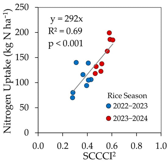 This study validated the SCCCI2 model for N uptake estimates at panicle initiation in a different variety, site, and growing seasons from the ones the model was developed. The better performance of the SCCCI2 model in estimating N uptake in comparison with single-vegetation-index models using other chlorophyll-sensitive vegetation indices and the similar performance to that of a stepwise multiple linear regression model confirm the suitability of the SCCCI2 for N uptake monitoring.