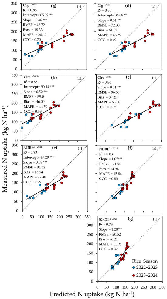Measured versus predicted nitrogen (N) uptake at PI using the published linear models (a) y = −91.66.Clg + 33.95, R2 = 0.88, (b) y = −104.64.Clre + 54.86, R2 = 0.85 and (c) y = 567.47.NDRE2 + 70.56, R2 = 0.83 reported in Brinkhoff et al. [48], and (d) y = 23.79.Clg, R2 = 0.70, (e) y = 60.81.Clre, R2 = 0.73 (f), y = 311.NDRE2 + 29.7, R2 = 0.80, and (g), y = 273.SCCCI2, R2 = 0.73 reported in Carracelas et al. [24]. Dot line = 1:1. Parameters were statistically significant at p < 0.01 ‘**’ and p < 0.001 ‘***’. RMSE = root mean square error. R2 = coefficient of determination. MAPE = mean absolute percentage error. CCC = concordance correlation coefficient. Model parameters are shown only when they are statistically significantly different.