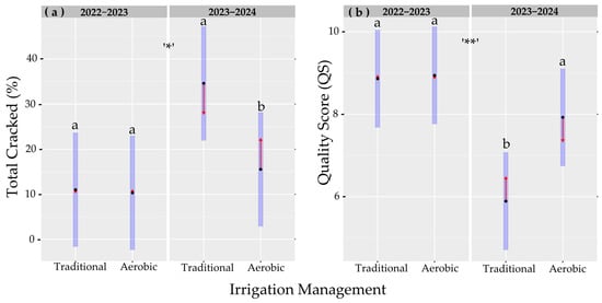 Total cracked grain percentage (a), and quality score (b), for the water management strategies within each rice growing season. Black dots represent the mean values, blue bars indicate the standard error, and red arrows indicate the confidence interval. Different letters between water strategies within each rice growing season indicate statistically significant differences with the following probability: p < 0.05 ‘*’, p < 0.01 ‘**’.