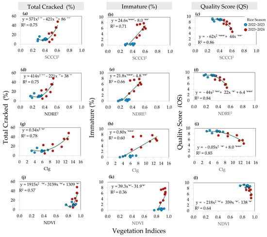 Relationships between percentage of total cracked grain, percentage of immature grain and quality score (QS) and vegetation indices (a–c) SCCCI2 (squared simplified canopy chlorophyll content index), (d–f) NDRE2 (squared normalized red edge vegetation index), (g–i) Clg (chlorophyll green index), (j–l) NDVI (normalized difference vegetation index), obtained at panicle initiation. Asterisks indicate statistical significance at p < 0.001 ‘***’, p < 0.01 ‘**’, p < 0.05 ‘*’.