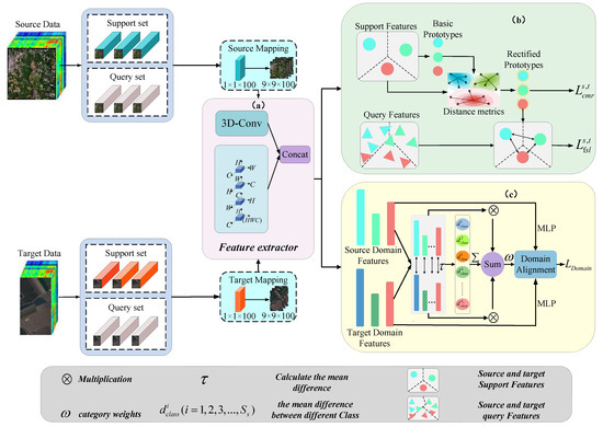To overcome the drawbacks of the previously described domain adaptation methods, we propose a novel cross-domain FSL framework based on class-discrepancy dynamic weighting (CDDW-CFSL) for domain-adaptive HSIC tasks. Firstly, the proposed class-weighted domain adaptation (CWDA) method dynamically assigns class-specific weights through calculating the mean discrepancy of corresponding categories between SD and TD. This approach enables a preferential focus on categories with more significant discrepancies between the source domain and the target domain during the domain adaptation phase. Furthermore, to ensure samples of the same class are more compact and make the class weights calculated by class means during the domain adaptation stage more representative, a class mean refinement (CMR) method is proposed. This approach imposes constraints on class prototypes, thereby providing more reliable class prototypes for subsequent domain adaptation. In addition, the framework introduces a cross-dimensional feature extraction mechanism, which mainly consists of the efficient multi-scale dimensional feature fusion (EMDF) method. The method separates hyperspectral imagery channel-wise into distinct components and then utilizes differently sized convolution kernels to derive features from every partitioned section. This allows for the effective integration of spectral and spatial information; more generalized and semantically rich feature representations are constructed across the source and target domains. By combining these multi-dimensional features, the framework facilitates feature alignment between SD and the TD. Finally, the framework can transfer knowledge across the rich labeled information in the SD and the limited labeled information in TD, thanks to the framework’s integration of the previously described methods and simultaneous FSL operations on SD and TD.