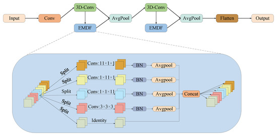 where represents the channel-wise concatenation operation, represents the output result of the EMDF method, and X represents the output result of the residual connection between the 3D-CNN and EMDF method.