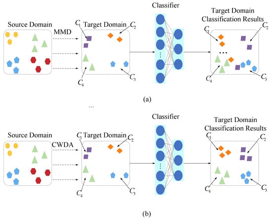 Class-level domain adaptation. (a) Using regular MMD; (b) using class-weighted MMD.