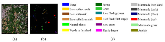 Chikusei dataset. (a) Ground-truth image. (b) Pseudo-color composite image. (c) Corresponding color labels.
