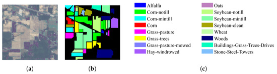NASA’s AVIRIS (Airborne Visible/Infrared Imaging Spectrometer) sensor collected the Indian Pines (IP) dataset in a northwest Indiana agricultural region. Farmland makes up the majority of the region, with a small amount of woodland and urban structures. The scene size is pixels, and the spatial resolution is 20 m (each pixel represents a ground area of m). There are 202 spectral bands in the picture, spanning the 400–2500 nm range. There are sixteen land cover categories in the dataset, such as woods, railroads, and residential areas. Each land cover class’s names and sample numbers are included in Table 2, and the pseudo-color composite picture and matching ground truth map are displayed in Figure 6.