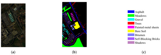 Pavia University dataset. (a) Ground-truth image. (b) Pseudo-color composite image. (c) Corresponding color labels.