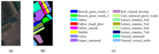 Salinas dataset. (a) Ground-truth image. (b) Pseudo-color composite image. (c) Corresponding color labels.