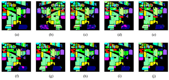 Indian Pines. (a) Ground-truth map. Classification results for different methods: (b) SVM; (c) 3-D-CNN; (d) DFSL; (e) DCFSL; (f) GIA-CFSL; (g) ADAFSL; (h) DMCM; (i) FDFSL; (j) our method.