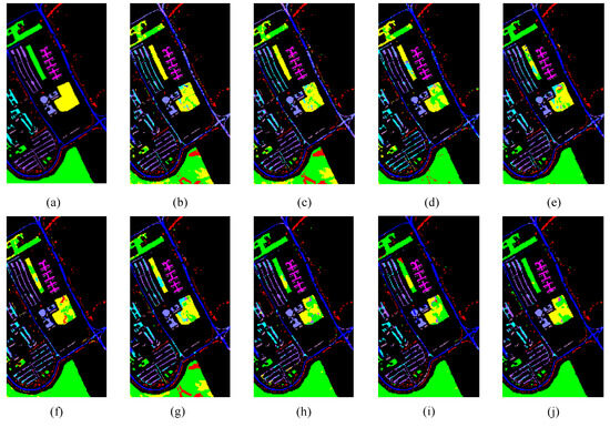 Pavia University. (a) Ground-truth map. Classification results for different methods: (b) SVM; (c) 3-D-CNN; (d) DFSL; (e) DCFSL; (f) GIA-CFSL; (g) ADAFSL; (h) DMCM; (i) FDFSL; (j) our method.