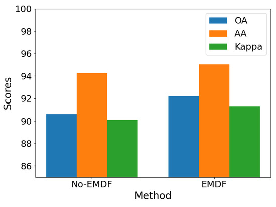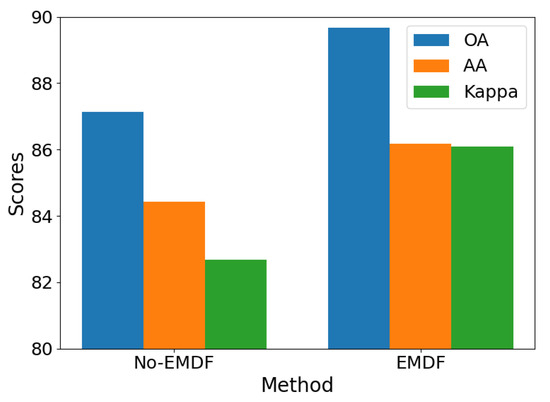 This section presents a comparative analysis of the efficient multi-scale dimensional feature fusion (EMDF) method’s influence on the classification accuracy of TD datasets. To validate the method’s effectiveness, we designed rigorous comparative experiments evaluating both the original framework and the improved framework, incorporating the EMDF method on three representative hyperspectral remote sensing datasets: Indian Pines (IP), Pavia University (PU), and Salinas Valley (SA). As shown in Figure 12, Figure 13 and Figure 14, a quantitative analysis demonstrates significant accuracy improvements across all three benchmark datasets after the EMDF method was implemented: the IP dataset achieved a 3.01% accuracy increase, PU improved by 2.55%, and SA showed a 1.59% enhancement. The experimental results confirm that the proposed EMDF method, through its unique cross-scale feature fusion mechanism, effectively integrates local detail features with global contextual information. This integration improves both the model’s classification accuracy and its ability to generalize across different datasets.