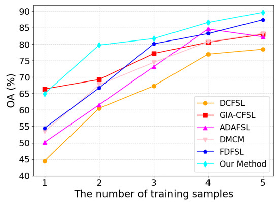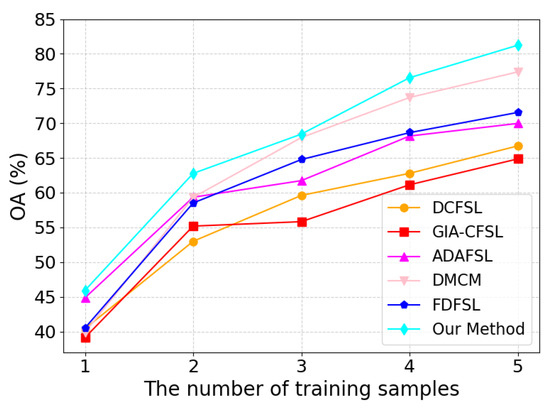 The number of training samples greatly influences the model’s performance in cross-domain FSL. This subsection confirms the efficacy of our suggested framework by examining the precise effects of the amount of training samples on the performance of SVM, 3DCNN, DFSL, and cross-domain FSL techniques. As shown in Figure 15, Figure 16 and Figure 17, from the set 1, 2, 3, 4, 5, we chose at random how many labeled samples there were in each class. The findings of the experiment demonstrate that the classification accuracy and generalization capacity of each approach may be considerably enhanced by suitably expanding the number of training samples in TD. The model has a tendency to overfit when there are few training samples available; however, as the number of samples increases, the model can better learn class features, thereby improving classification accuracy. Notably, our suggested framework continuously outperformed all other approaches, irrespective of the quantity of training samples. This outcome clearly shows how successful our system is.