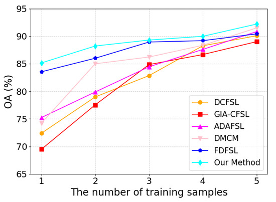 During the FSL phase, the HSIC task is decomposed into multiple C-way K-shot classification sub-tasks (where C denotes the number of classes in each episode’s support set, and K indicates the number of samples per class). The support set comprises 1 sample per class, whereas the query set contains 19 samples per class. Theoretically, increasing the number of query samples improves the network’s classification performance on TD. Three metrics are adopted for evaluation: the Kappa coefficient (Kappa), average accuracy (AA), and the overall accuracy (OA).