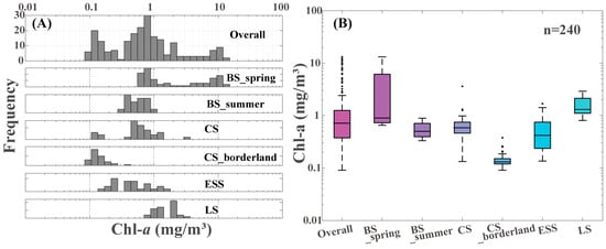 Histogram (A) and boxplot (B) showing the distribution of Chl-a concentrations () in the mixed layer across six regions: Bering Sea (BS), Chukchi Sea (CS), East Siberian Sea (ESS), and Laptev Sea (LS), including the CS borderland. The histogram in (A) provides frequency distributions, with “Overall” representing the full dataset. The boxplot in (B) displays the median, IQR, and outliers, where black points beyond the whiskers indicate values exceeding 1.5 IQR.