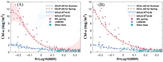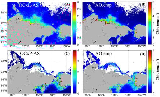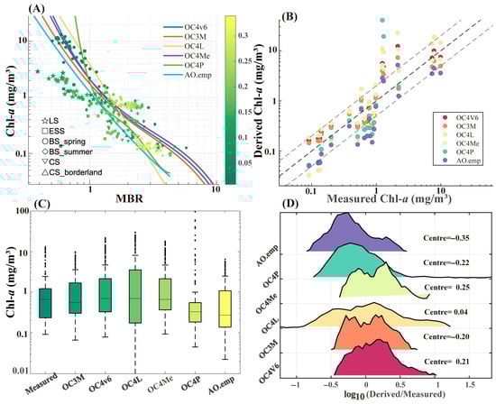 Based on the extrapolated , we employed six different OCx algorithms to derive the Chl-a concentration of the upper ocean and compared them with in situ measurements. The results indicate that the global algorithms from three satellite sensors (OC4v6, OC3M, OC4Me) and two Arctic regional algorithms (OC4L, OC4P) generally overestimate Chl-a concentration in the Arctic shelf, as shown in Figure 3A,B, with overestimation coefficients ranging from 1.68 to 2.92 (Table 5). Only the AO.emp algorithm showed a marked underestimation, with retrieved values averaging 1.02 ± 1.53 and being 0.87 times the in situ measurements. Empirical algorithm performance varied by region, with the strongest fit observed in the BS_spring, where in situ measurements aligned closely with algorithm estimates (the correlation between Chl-a and exceeded 0.74; []). Under these conditions, which approximate Case I optical properties, global algorithms yielded reliable Chl-a retrievals at concentrations exceeding 1.0 . Some stations in LS and ESS also recorded Chl-a > 1 but the results from the MBR curves were significantly higher than observed values. Drozdova [] reported surface DOC concentration at the Lena River mouth ranging from 242.5 to 886.7 with at 350 nm, ranging from 2.36 to 11.17 . Such elevated CDOM levels can significantly bias Chl-a retrievals upward in this region [,]. For other stations characterized as typical polar low-nutrient waters, the derived values from the algorithms were generally overestimated, but the absolute errors were relatively smaller compared to regions with Chl-a > 1.0 .