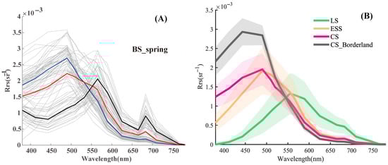 spectra of BS_spring and other regions (A,B). In panel (A), the gray lines represent the spectra from all stations, with blue, black and red lines representing the average spectra for Types I, II, and III, respectively. In panel (B), the lines represent the average for each region, and the shaded areas indicate average ± standard deviation.