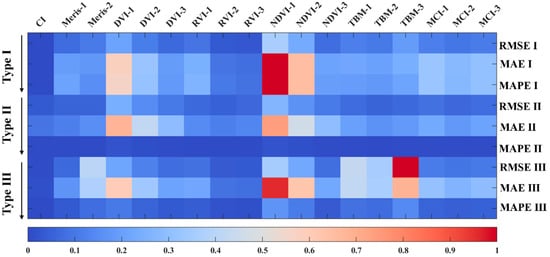 Heatmap illustrating the performance of various NIR algorithms for retrieving Chl-a, where color intensity indicates the magnitude of the error: darker red representing higher errors, and blue representing better performance. ‘Meris-1’ and ‘Meris-2’ represent two-band and three-band algorithms, respectively, while for other algorithms, 1, 2, and 3, respectively, denote Linear, Power, and Polynomial forms. To standardize comparisons and highlight relative algorithm performance, we normalized each metric (RMSE, MAE, MAPE) by scaling the results to a range of 0–1. Normalization followed this method: , where represents each statistical metric.