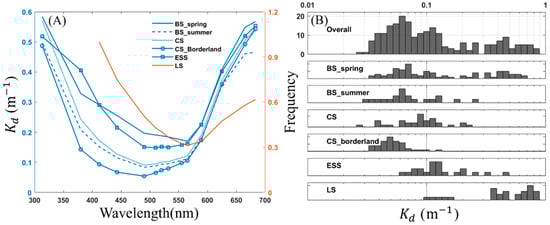 Average for the study area within the 313–683 nm (A) and the frequency distribution of at the 490 nm wavelength (B). Histogram (B) showing the frequency distribution of in the mixed layer across six regions: Bering Sea (BS), Chukchi Sea (CS), East Siberian Sea (ESS), Laptev Sea (LS), and the CS borderland. “Overall” represents the entire dataset.