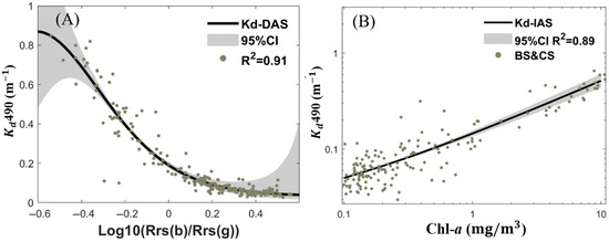 - Indirect Empirical Algorithm (-Indirect). Morel and Maritorena [] assumed that regional attenuation is primarily influenced by phytoplankton along with co-varying contributions from yellow substances and non-algal materials. Under this framework, a power-law function is commonly used to approximate the link between and Chl-a. Thus, a two-step empirical model relating , Chl-a, and can be constructed: