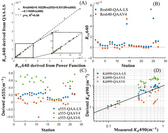 - Quasi-Analytical Algorithm (QAA). Quasi-analytical models are grounded in radiative transfer principles, linking the ocean’s apparent optical properties (AOPs) to its inherent optical properties (IOPs) and environmental boundary factors such as illumination geometry and surface conditions []. A crucial step in processing QAA is determining the absorption coefficient and the backscattering coefficient from . Once and along with the boundary conditions are known, can be calculated from the quasi-analytical model [,]. The contributions of and to attenuation are empirically quantified in the formula: