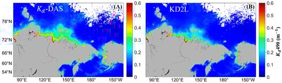 Since the at 490 nm is an important parameter in applications, we analyzed its frequency distribution in the Arctic Shelf. As shown in Figure 6B, the main range of is concentrated between 0.03 and 0.12 (frequency > 10), defining 0.1 as the boundary between medium and low values for the study area. Clearly, the medium–high value areas are mainly distributed in the BS_spring, ESS, and LS, while the attenuation of marine source waters in summer is primarily concentrated in the medium–low value areas. Compared with the Chl-a frequency distribution in Figure 2A, elevated Chl-a concentrations are linked to stronger light attenuation, suggesting that regions influenced by marine source waters experience greater attenuation as biomass increases. However, despite having lower Chl-a concentrations than those observed in BS_spring, terrestrial source waters exhibit greater attenuation. This indicates that, beyond pigments, other optically active constituents significantly contribute to the attenuation of radiation in water bodies. Morel et al. [] also found that the contribution of pigment to increasing attenuation is limited: in Case I waters, is likely to exceed 0.5 only at Chl-a approaching 20 . In the LS region, however, are 0.51 ± 0.24 as the Chl-a is only 1.68 ± 0.70 .