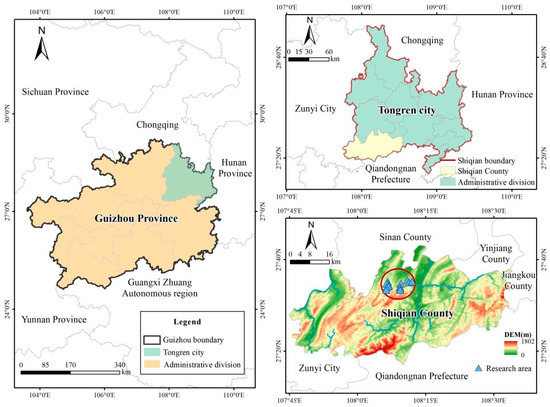 The images of planting holes in this study were obtained from planting areas in Longjing Gelao Dong Township, situated northwest of Shiqian County, Tongren City, Guizhou Province. This region exhibits a complex terrain characterized by typical karst landforms and an average elevation of approximately 818 m. The geographical coordinates for the study area are 27°37′N latitude and 108°10′E longitude. Figure 1 illustrates the location of the study area.