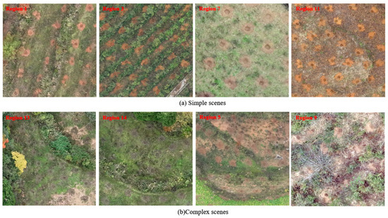 In this study, 14 aerial orthophotos were generated from 14 images acquired by unmanned aerial vehicle (UAV) aerial photography technology with a spatial resolution of 0.05 m and subsequent necessary processing steps to acquire digital orthophoto maps. To assess the model’s detection capability in complex scenes, these images were categorized into two parts: simple scenes and complex scenes (Table 1 and Figure 2). In a simplified scenario, the planting holes conspicuously contrast with the surrounding environment. However, over time, the pervasive influence of the surroundings gradually obscures these planting holes into the backdrop, presenting a formidable challenge for accurate identification within intricate environments.