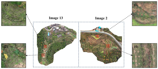 The results of the comparative detection experiments indicate that the performance of the YOLO-PH model is significantly influenced by scene complexity. To further assess its robustness and adaptability under challenging environmental conditions, four representative 20 m × 20 m subregions were selected for evaluation. Two of these subregions were extracted from Image 13, which featured the most complex environmental background, while the remaining two were taken from Image 2, characterized by the lowest detection performance across all test scenes. Detailed spatial configurations and characteristics of these subregions are illustrated in Figure 8.