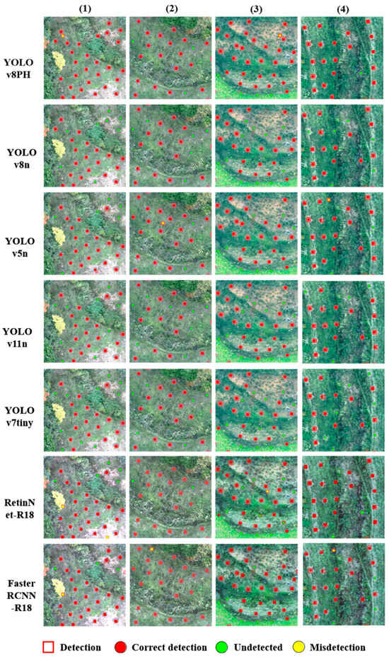 In contrast, the YOLO-PH model exhibited superior performance across all subregions, highlighting its robustness in complex environments. In subregion 1, it achieved an F1-score of 0.98, with only a single missed target, demonstrating near-perfect detection accuracy. Similarly high performance was observed in subregions 2, 3, and 4, with minimal instances of false negatives. While occasional false positives were noted—attributable to the model’s enhanced feature extraction capabilities and sensitivity to fine-grained texture—the overall detection accuracy remained exceptionally high.