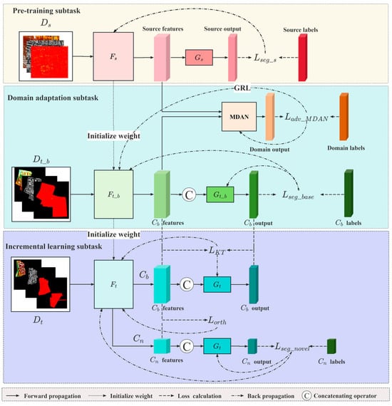 The workflow of the proposed method is illustrated in Figure 1. To provide a clearer description, the same categories in the source and target domains are defined as base categories, and the unique categories in the target domain are defined as novel categories. The detailed definition is presented in Section 2.1. Existing studies have shown that asymmetric mapping can better simulate the differences in low-level features than symmetric mapping []; therefore, the pre-training subtask was separated from the domain adaptation subtask. Another advantage is that when facing a new dataset, there is no need for additional pre-training. At the same time, due to the presence of novel categories in the target domain, the model should continue to learn and acquire the ability to segment novel categories. However, introducing novel categories into the model may lead to a sudden loss of knowledge regarding base categories—a phenomenon known as catastrophic forgetting in transfer learning []. To mitigate this issue, an incremental learning subtask is proposed to enable the model to segment novel categories while avoiding catastrophic forgetting.
