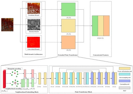 Given that the source domain may comprise multi-source datasets with inconsistent categories, point densities, and other attributes, a Multi-branch Feature Extractor (MFE) based on the Point Transformer was designed, as illustrated in Figure 2. The input data was divided into different branches, such as a coordinate branch, an intensity branch, and an echo-related branch, according to the types of parameters they contained. Feature aggregation within each branch was conducted by extended Point Transformer with proposed Neighborhood Embedding Block (NEB). Finally, the features learned from multiple branches were concatenated and fed into subsequent processing, such as classifiers.