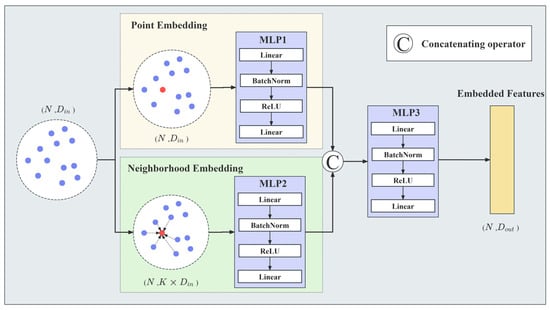 In traditional classifiers for airborne LiDAR point clouds, it is necessary to handcraft features from raw data and input them into a classifier []. Neighborhood-based features, such as eigenvalues, play a crucial role in point cloud classification. Drawing on this insight, we hypothesize that incorporating point neighborhood information into the embedding module can effectively enhance the overall performance of the network. As shown in Figure 3, the NEB includes three steps: Firstly, parameters of the current point were embedded using MLP1. Secondly, parameters of the K-nearest-neighboring points were embedded by MLP2. Finally, the two encoded features were aggregated to obtain the finally embedded features through MLP3.