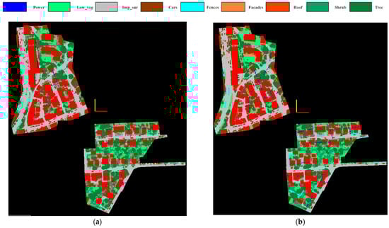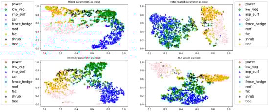Thus, to our knowledge, there is currently limited research on the impact of different parameters on ALS point cloud semantic segmentation. In order to more intuitively demonstrate the impact, t-Distributed Stochastic Neighbor Embedding (t-SNE) was employed to evaluate the effectiveness of the learned features. The experiments were conducted on the ISPRS benchmark dataset and Point Transformer. The preprocessing of input data was the same as that of existing deep learning methods. The network was trained using the training set and was applied to the testing set. The features input into the classifier were taken out for visualization, as shown in Figure 3. Four combinations were conducted separately: