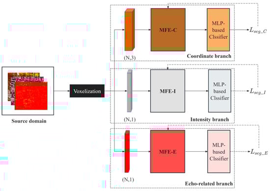 The purpose of the pre-training subtask is to pre-train the feature extractor with multi-source ALS data. The larger the amount of pre-training data, the better the generalization performance of the pre-trained model []. Thus, we aimed to utilize as much data as possible for pre-training. However, multi-source ALS data involves diverse types of parameters. To address this issue, we constructed a three-branch architecture for the feature extractor, specifically comprising a coordinate branch, an intensity branch, and an echo-related branch. Each branch consists of an MFE and an MLP-based classifier.