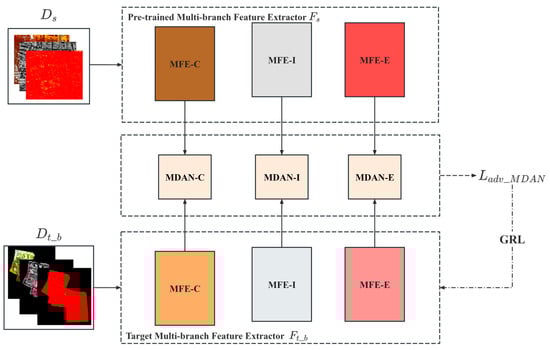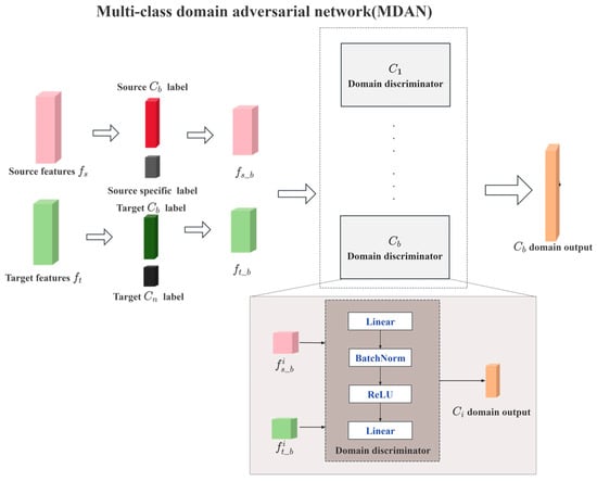 To address the above issues, inspired by Multi-Adversarial Domain Adaptation (MADA) [], a separate adversarial network named Multi-class Domain Adversarial Network (MDAN) was proposed, as shown in Figure 6 and Figure 7. From Figure 6, domain-adversarial training was applied to each branch of the pre-trained Multi-branch Feature Extractor, aligning the feature distribution through MDAN. As shown in Figure 7, in MDAN, one discriminator corresponds to one base category; hence, there is an equal number of discriminators and base categories. The advantage of setting multiple discriminators is to alleviate negative transfer by preventing false alignment of modes in different distributions across domains. In the implementation of MDAN, the output features of the source feature extractor and the output features of the target feature extractor were selected by labels separately to obtain , as the input of MDAN. In MDAN, multiple domain discriminators were designed with the same number as ., were input into the MLP-based domain discriminator to obtain the domain output, and adversarial loss was calculated and backpropagated through Gradient Reverse Layer (GRL). Compared to MADA, our method has the following advantages: (1) freezing the pre-trained feature extractor helps to preserve the feature extraction abilities of the source domain and improve the ability to extract domain invariant features, and (2) using labels instead of category probabilities to determine which discriminator the sample should input can help with positive transfer, avoiding negative transfer caused by misclassification.
