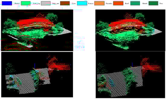 The experimental results are presented in Table 9. Each experiment was conducted five times, with the averages and ranges of the F1 scores, OA, and averF1 reported, along with p-values for OA and averF1 comparing M1 and M2. Both p-values (for OA and averF1) were less than 0.05, indicating a statistically significant difference between M1 and M2. As observed, the multi-branch architecture significantly improved performance across all nine categories. Among them, the segmentation accuracy of powerlines and fences showed the most substantial increase, which can be attributed to the separate echo-related branch effectively extracting their internal structural features. There was also a noticeable improvement in low_veg segmentation, possibly due to the intensity branch’s capability to extract distinguishable features. For buildings, the enhanced segmentation accuracy may stem from the unique geometric features extracted by the coordinate branch. Combined with the t-SNE analysis in Section 2.3 and the experimental results, the multi-branch architecture is confirmed to be superior to the single-branch counterpart. This superiority may be attributed to the fact that different parameters correspond to distinct physical characteristics, enabling the multi-branch architecture to more effectively learn features that distinguish various ground objects.