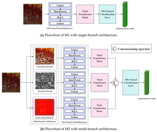 In the existing deep learning methods for point cloud semantic segmentation, the most commonly selected parameters include coordinate values, intensity, echo-related parameters, etc. These parameters are fed to the network simultaneously for feature learning. Though simple in network design, due to the different characteristics of ground objects reflected by different parameters, it might lead the inconspicuous features weighing out the salient ones, thereby decreasing the final segmentation accuracy. Numerous studies explore the relationship between input parameters and segmentation accuracy [,]. However, these studies also adopt the simultaneous input of parameters, leading to severe coupling of the influences exerted by different parameters. This coupling hinders the ability to discern the relationship between learned features and ground objects.