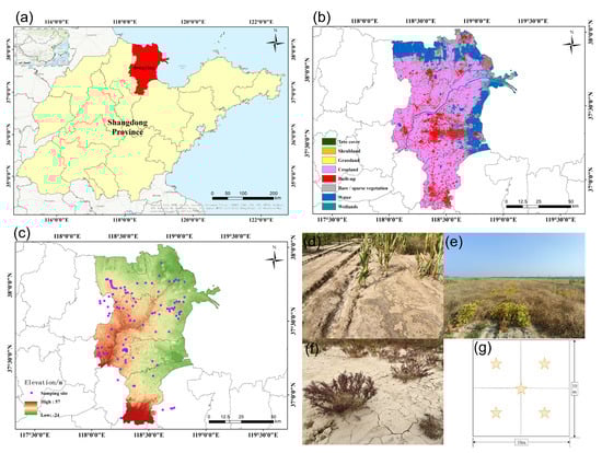 Sampling locations and positions in Dongying city. (a) Dongying’s location in Shandong Province. (b) Land cover types in Dongying city. (c) Sampling locations and elevations in the Dongying city region. (d–f) landscape photos of sampling points. (g) Sampling plots.